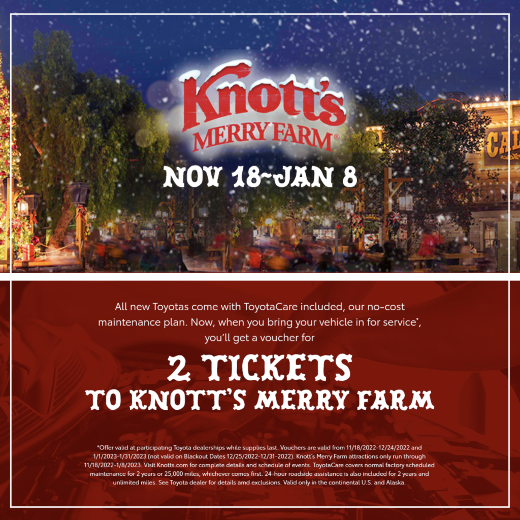 | The temperature seems to be dropping lower by the day and soon enough roads will be covered in snow, salt, and ice! Is your ride ready to take on the new season? You sure wouldn’t want to get caught breaking down out in the cold! And if that isn’t enough of an incentive, from November 18th to January 8th, 2022 when you service your ride at Simi Valley Toyota using ToyotaCare, you could receive a voucher for 2 tickets to Knott’s Merry Farm FREE of charge! Don’t miss out on this opportunity to get your routine maintenance out of the way and spread a little holiday cheer! Claim your offer today and schedule your service appointment through the Simi Valley Toyota Service Center at 2380 First St, Simi Valley, CA 93065! Our team looks forward to getting your Toyota into tip top shape! | ![]() |
