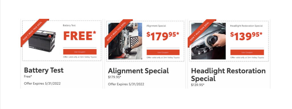 - Of course, everyone likes to save a little money here and there. We’ve got you covered in that category! With both new vehicle offers and service offers changing on a monthly basis, there’s always something waiting for each customer right here!
