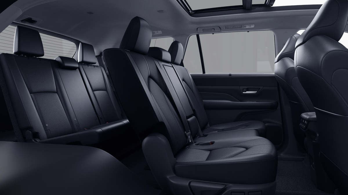 • 7-passenger seating with second-row fold-down captain's chairs and fold-down inboard armrests, adjustable headrests and two cup holders mounted on the floor; and 60/40 split, fold-down third-row seats with sliding headrests and recline function